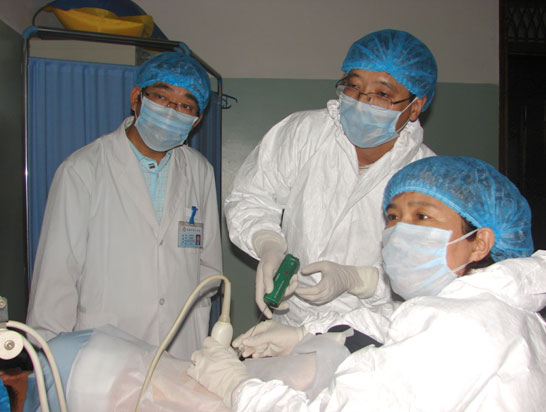 科室设备:2004年科室购进麦迪逊-6000C腹部彩色多普勒显像仪一台,为我科在腹部血管和小器官方面工作奠定良好基础。2005年科室购进德国产亚当-3D黑白超声显像仪一台。2009年科室新购一台GE-LOGIQ5彩色多普勒显像仪。2013年新购置一台超声定位碎石机。